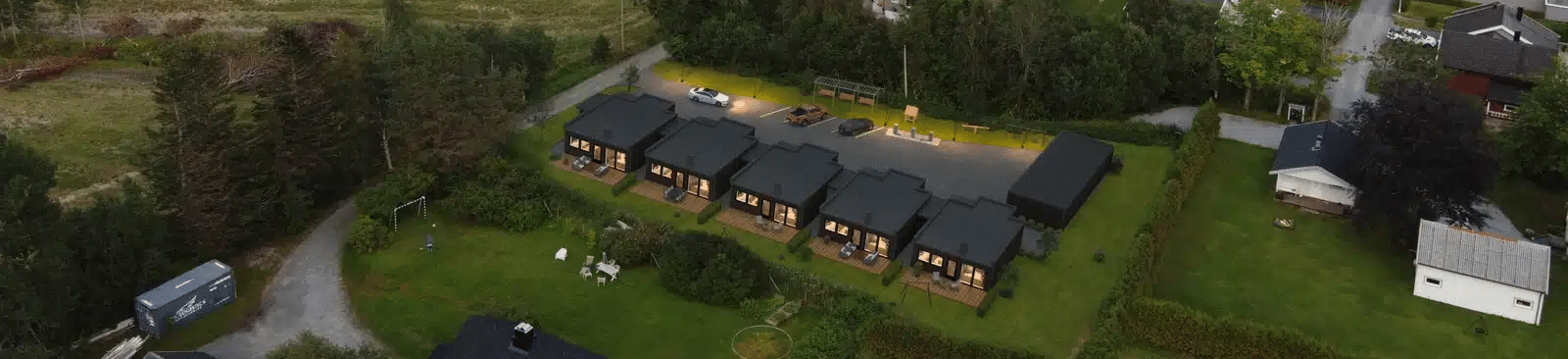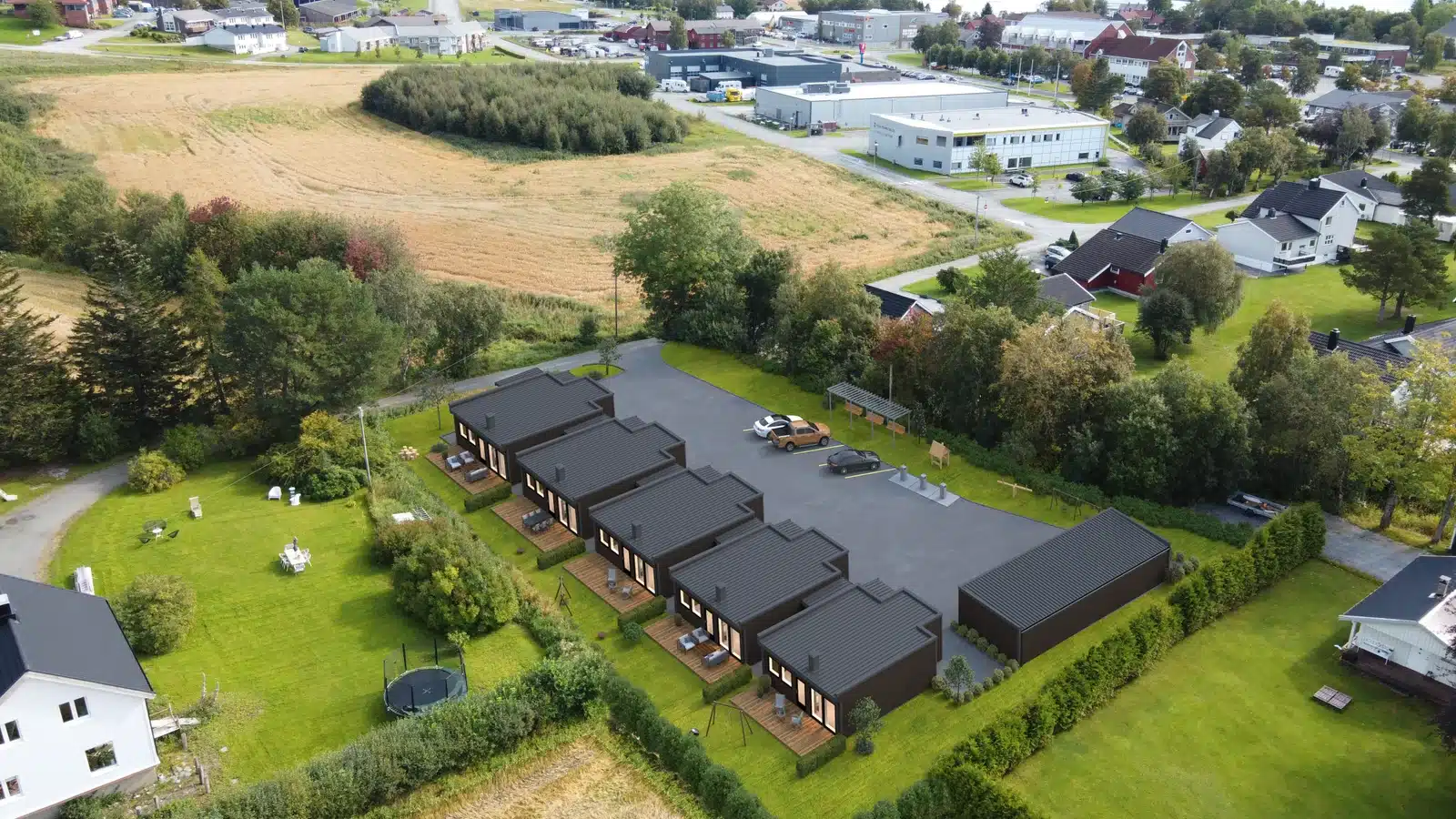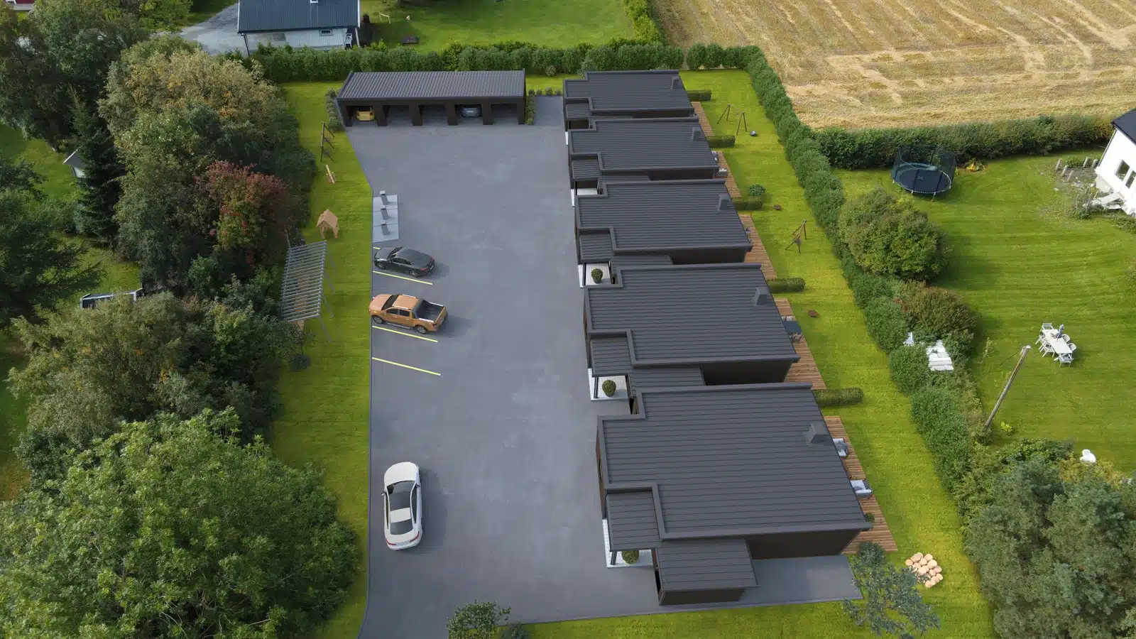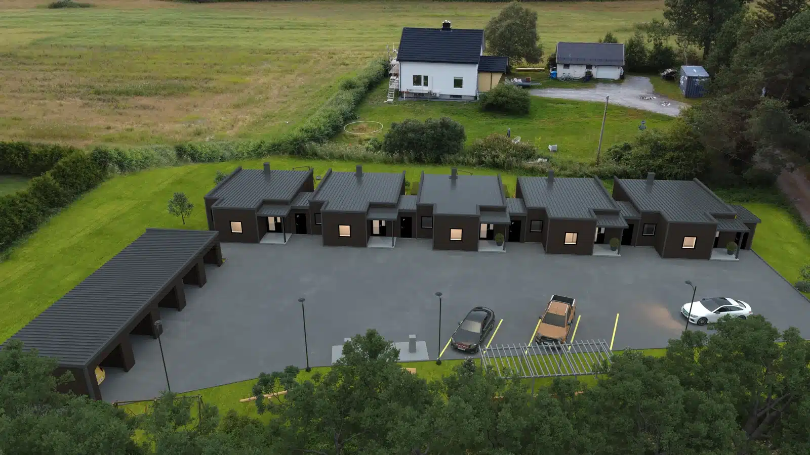 I tillegg vil hver leilighet ha egen carport/garasje i felles garasjebygg. Det vil også være bra med oppstillingsplasser ellers på eiendommen.